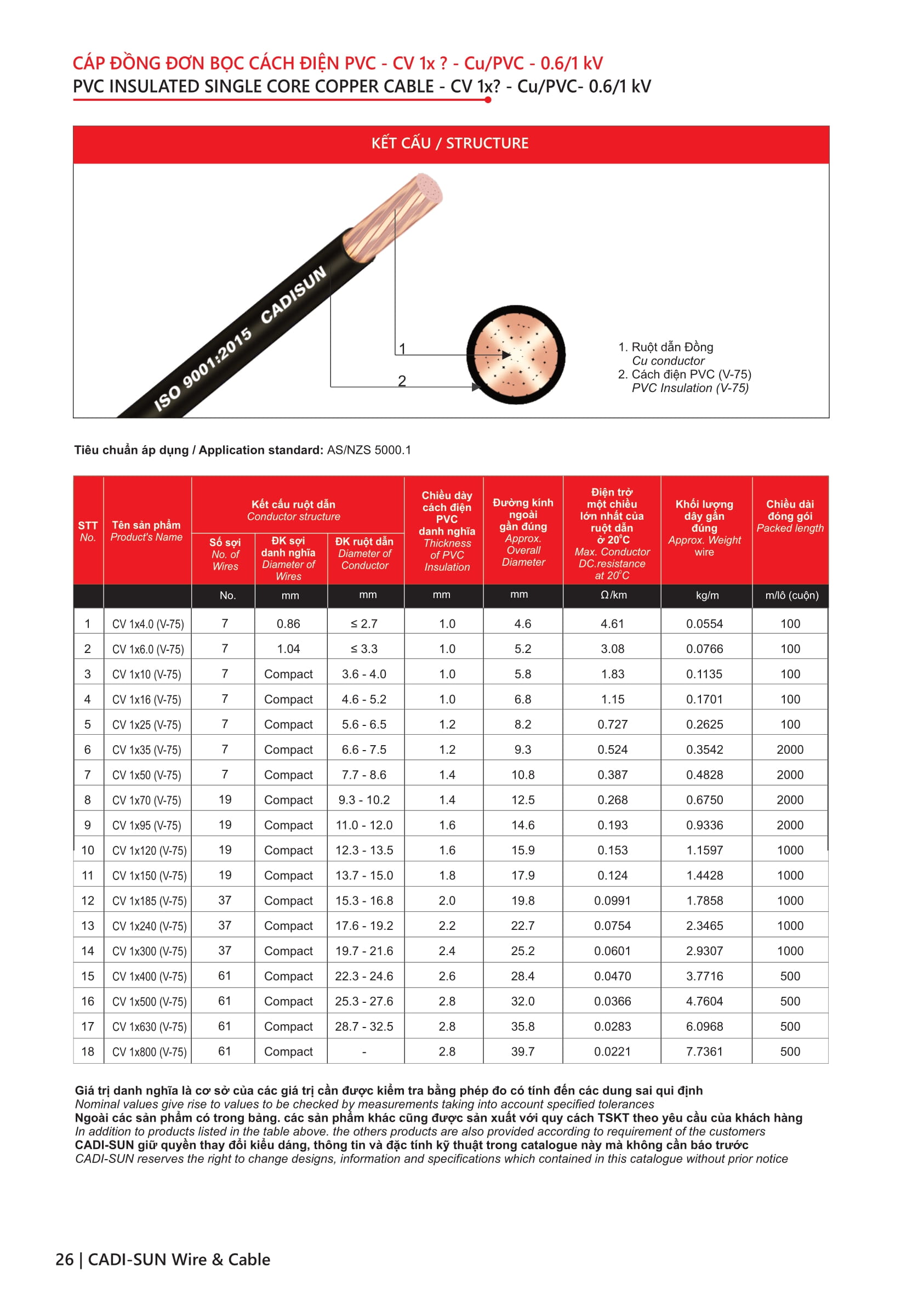 - Quy cách: Cu/PVC