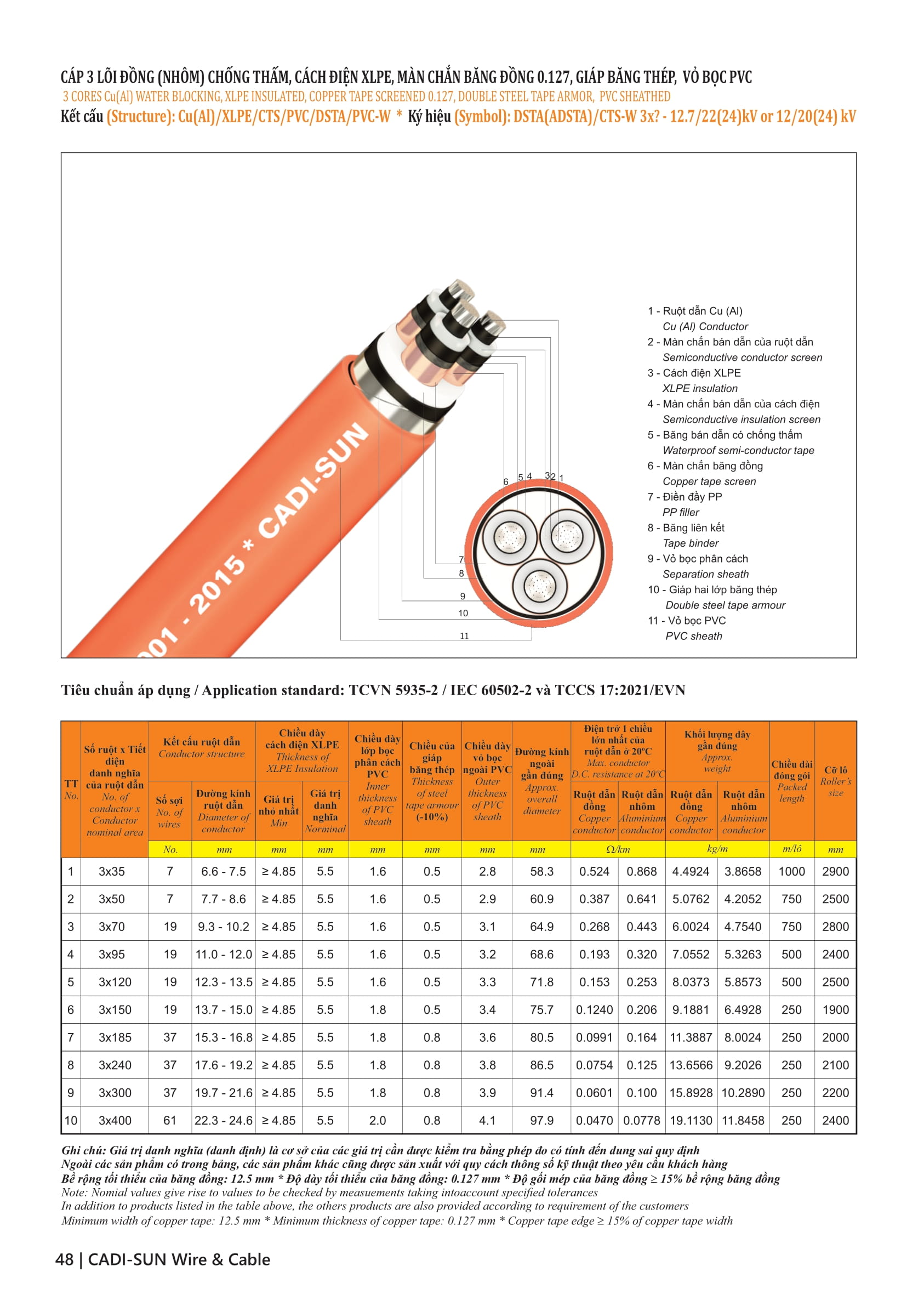 - Vật liệu: cách điện XLPE vỏ bọc PVC, Fr-PVC hoặc HDPE