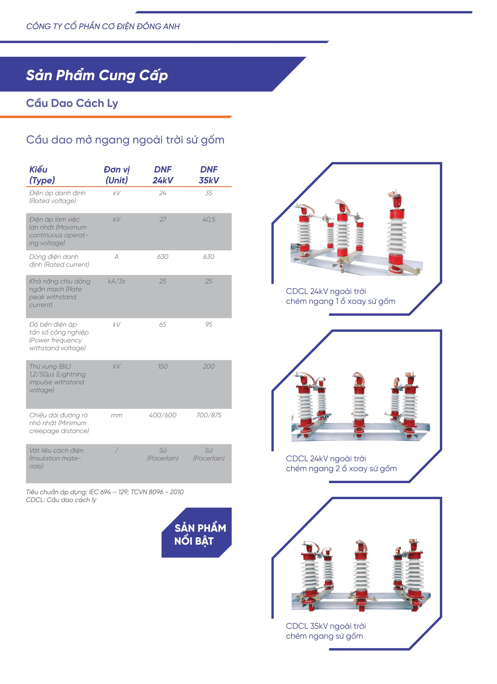 - Cầu dao cách ly ngoài trời chém ngang 24kV sứ gốm Cơ điện Đông Anh được sử dụng để đóng, cắt trong trạng thái không có tải cho lưới điện, trạm điện phân phối trung thế.